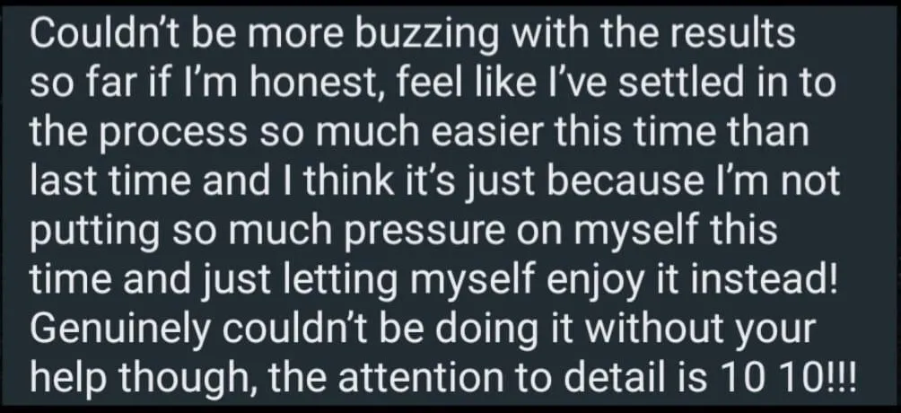Results will of course vary from person to person so I cannot give a definite answer on the final result as everyone's goals and starting point will be different. I am confident based on people I have worked with over the years that I can get anyone a results who follows my guidance and therefore have a 30 day money back guarantee.