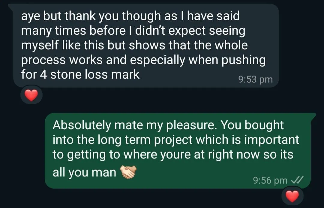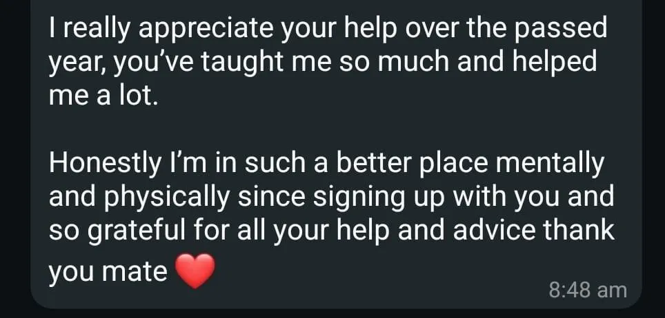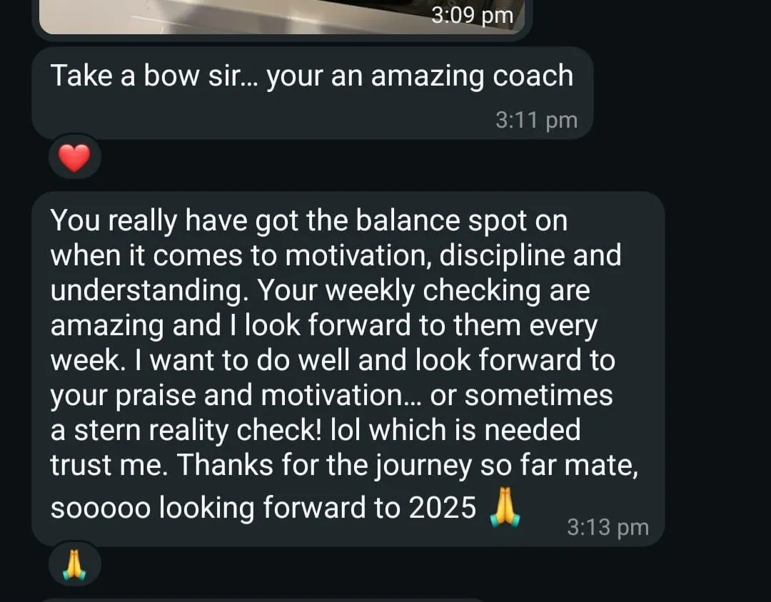 Each person always gets a personalized program. This is what makes me different to other coaches or programs you may have tried before. Although I implement my training philosophy and overall methodology to everyone, you will not receive a cooker cutter program.